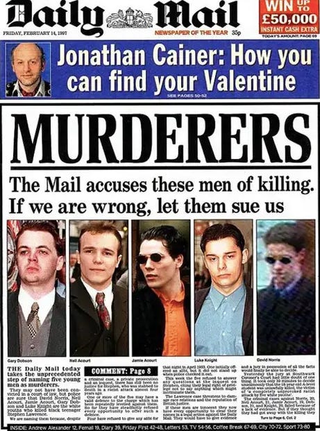 Ever since running a front page in February 1997 naming five men as Stephen’s ‘MURDERERS’ and daring them to sue, the newspaper has used its Lawrence campaign to shield criticism of its fire-stoking coverage of race, immigration and other issues that make it the bete noire of liberals.